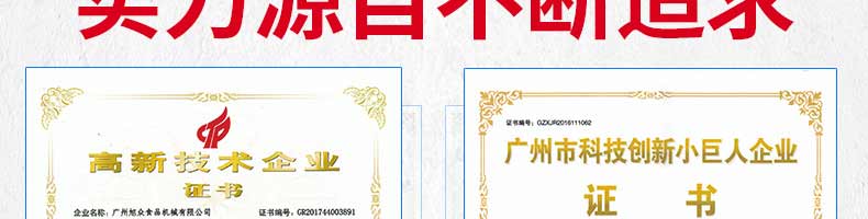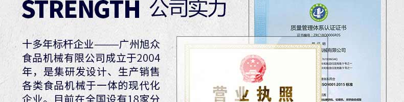 廣州旭眾食品機(jī)械有限公司是一家集科研開(kāi)發(fā),生產(chǎn)設(shè)計(jì),營(yíng)銷(xiāo)服務(wù)為一體的現(xiàn)代化生產(chǎn)企業(yè)?,F(xiàn)代化生產(chǎn)車(chē)間,精湛制造技術(shù),所產(chǎn)機(jī)械歷經(jīng)市場(chǎng)重重考驗(yàn),不斷贏得海內(nèi)外客戶(hù)的贊譽(yù)。