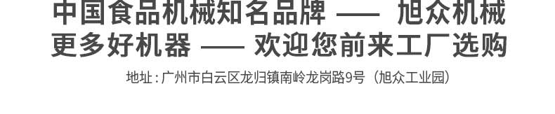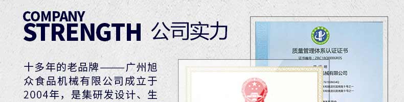 廣州旭眾食品機(jī)械有限公司是一家集科研開(kāi)發(fā),生產(chǎn)設(shè)計(jì),營(yíng)銷服務(wù)為一體的現(xiàn)代化生產(chǎn)企業(yè)。現(xiàn)代化生產(chǎn)車(chē)間,精湛制造技術(shù),所產(chǎn)機(jī)械歷經(jīng)市場(chǎng)重重考驗(yàn),不斷贏得海內(nèi)外客戶的贊譽(yù)。