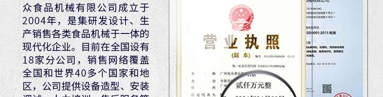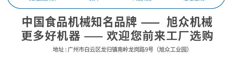 廣州旭眾食品機(jī)械有限公司是一家集科研開發(fā),生產(chǎn)設(shè)計(jì),營銷服務(wù)為一體的現(xiàn)代化生產(chǎn)企業(yè)?,F(xiàn)代化生產(chǎn)車間,精湛制造技術(shù),所產(chǎn)機(jī)械歷經(jīng)市場重重考驗(yàn),不斷贏得海內(nèi)外客戶的贊譽(yù)。