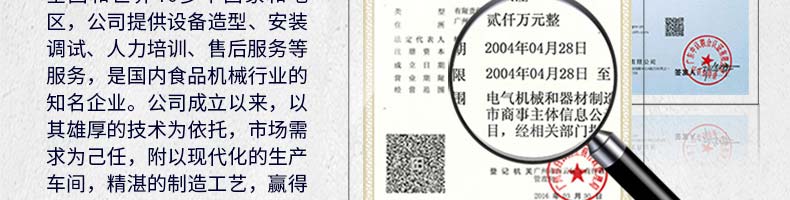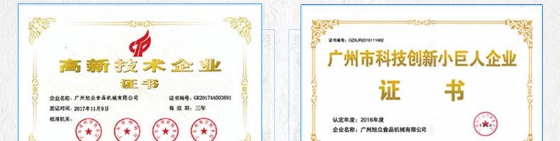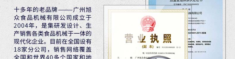 廣州旭眾食品機(jī)械有限公司是一家集科研開(kāi)發(fā),生產(chǎn)設(shè)計(jì),營(yíng)銷服務(wù)為一體的現(xiàn)代化生產(chǎn)企業(yè)?,F(xiàn)代化生產(chǎn)車間,精湛制造技術(shù),所產(chǎn)機(jī)械歷經(jīng)市場(chǎng)重重考驗(yàn),不斷贏得海內(nèi)外客戶的贊譽(yù)。