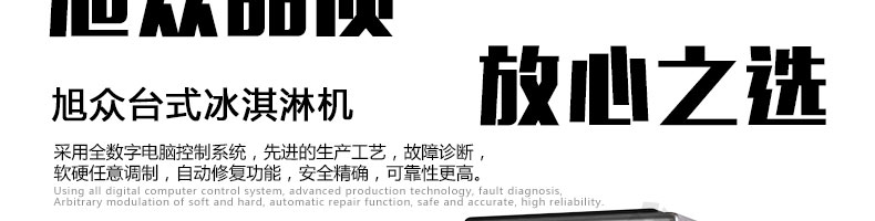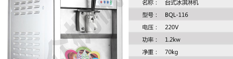 BQL-116臺式冰淇淋機,●選用國際名牌成熟制冷配套件和高效壓縮機,融合旭眾精湛工藝輔以嚴格的質量控制流程,使產品整體性能及品質得以全面提升?!癫捎萌珨?shù)字電腦控制系統(tǒng),選用名牌優(yōu)質電器元件,先進的生產工藝,故障診斷,軟硬任意調制,自動修復功能,安全精確,可靠性更高。●專業(yè)成熟制冷系統(tǒng)設計,選用世界名牌大功率專用壓縮機,大大縮短冰淇淋成型時間,相同時間內冰淇淋產量大幅度增加,使您生意火爆時依然得心應手,為您創(chuàng)造財富?!癜踩椒€(wěn)的機械攪拌系統(tǒng),噪音更低、振動更小,使整機運行性能達到國際先進水平?!翊_保進料溫度在0°C~35°C;環(huán)境溫度5°C~40°C勻可正常使用。