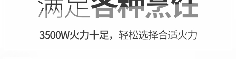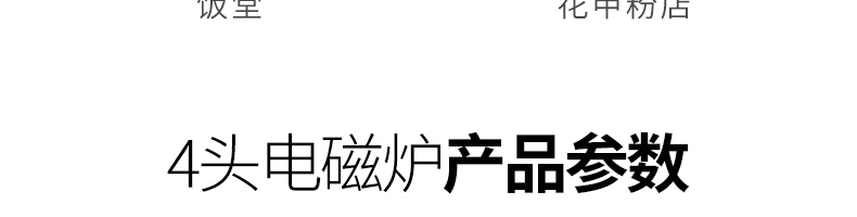 四頭柜式電磁爐,10檔調(diào)節(jié),滿足各種烹飪。3500W火力十足,輕松選擇合適火力。同時工作互不干擾單獨磁爐控制面板,設(shè)置不同大小檔數(shù),同時工作,互不干擾。