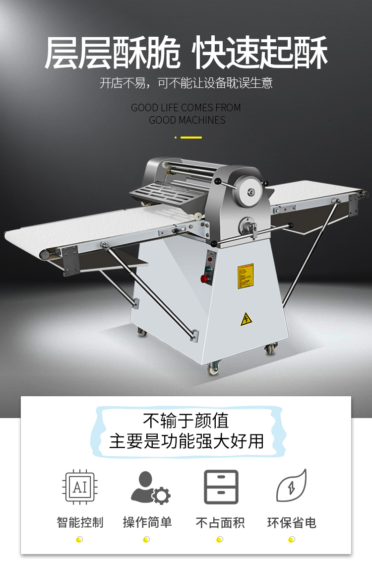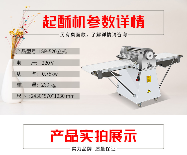 LSP-520酥皮機(jī),采用獨(dú)特的鏈輪傳動(dòng)替代了傳統(tǒng)易磨損的塑輪傳動(dòng),低噪音,高壽命滾輪經(jīng)過(guò)特殊工藝處理,不粘面,不易刮傷適用于手撕面包、羊角面包、蛋撻、老婆餅、千層餅,等酥皮類(lèi)食品,也可用于輾壓面團(tuán)。