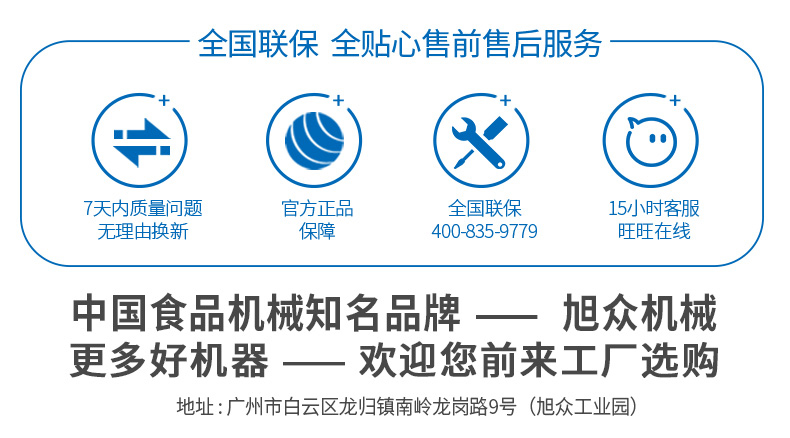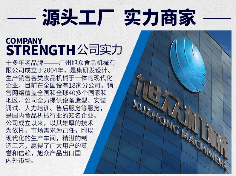 廣州旭眾食品機(jī)械有限公司是一家集科研開發(fā),生產(chǎn)設(shè)計(jì),營(yíng)銷服務(wù)為一體的現(xiàn)代化生產(chǎn)企業(yè)?,F(xiàn)代化生產(chǎn)車間,精湛制造技術(shù),所產(chǎn)機(jī)械歷經(jīng)市場(chǎng)重重考驗(yàn),不斷贏得海內(nèi)外客戶的贊譽(yù)。
