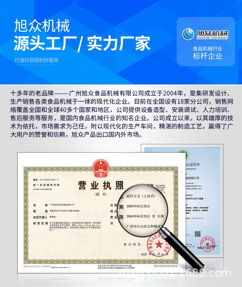 廣州旭眾食品機(jī)械有限公司是一家集科研開(kāi)發(fā),生產(chǎn)設(shè)計(jì),營(yíng)銷(xiāo)服務(wù)為一體的現(xiàn)代化生產(chǎn)企業(yè)?,F(xiàn)代化生產(chǎn)車(chē)間,精湛制造技術(shù),所產(chǎn)機(jī)械歷經(jīng)市場(chǎng)重重考驗(yàn),不斷贏得海內(nèi)外客戶(hù)的贊譽(yù)。
