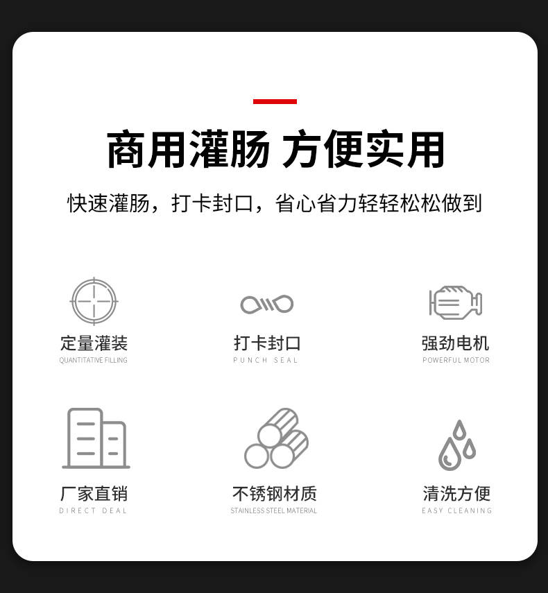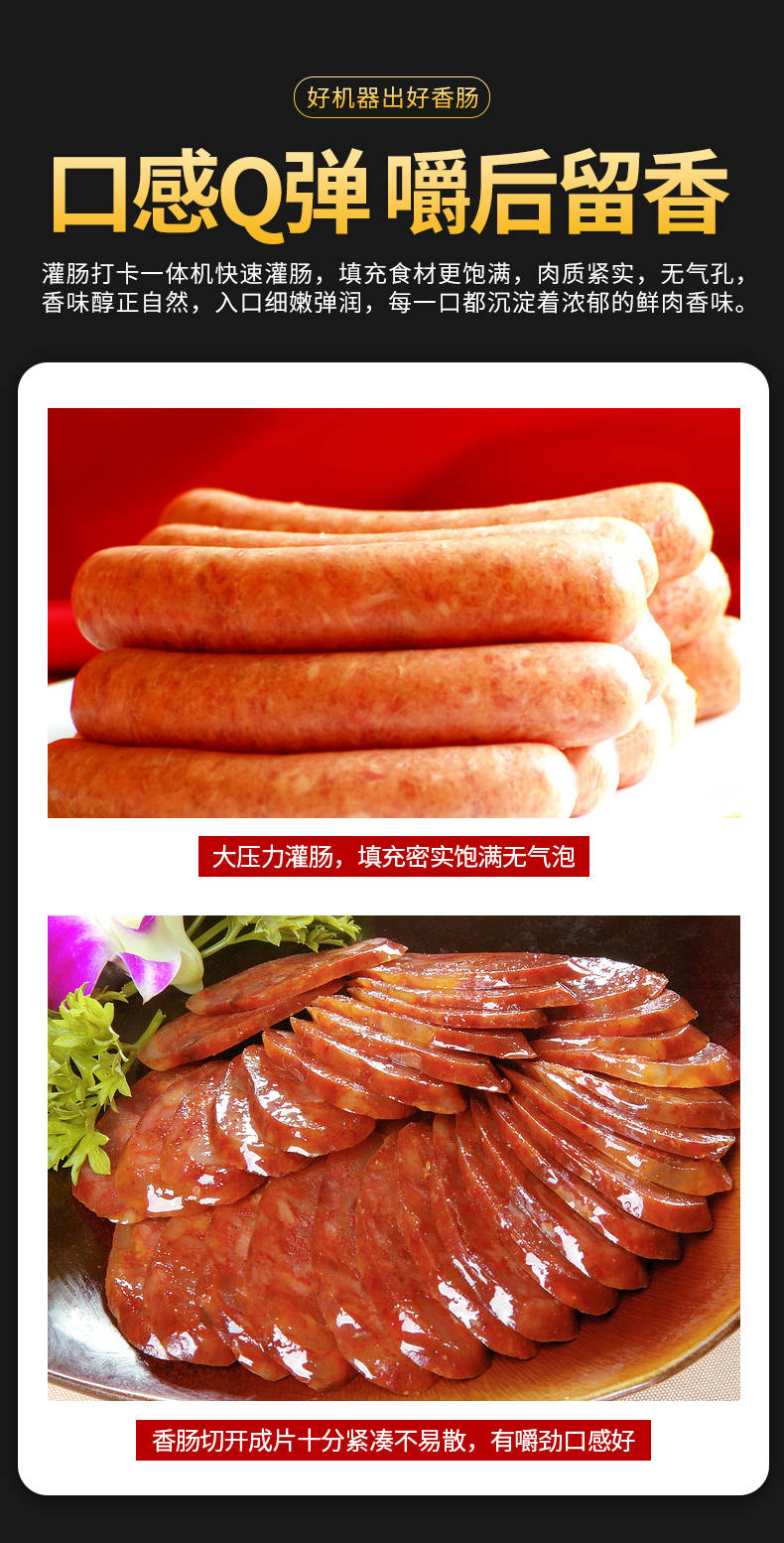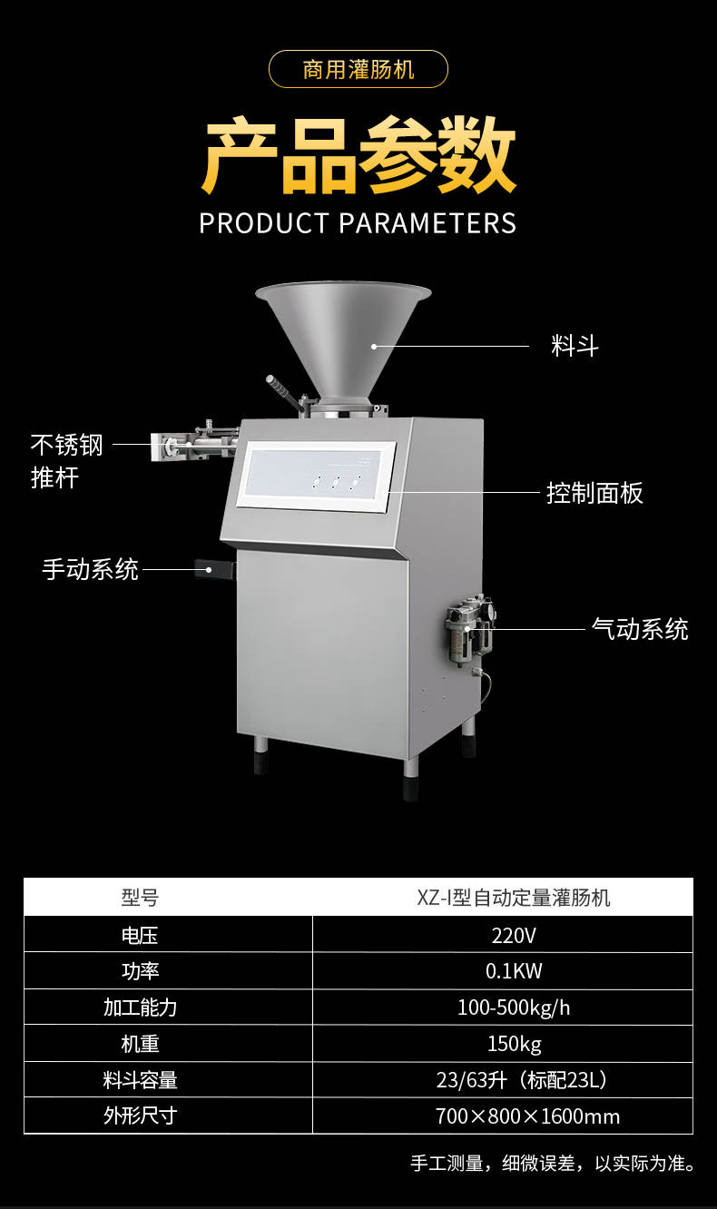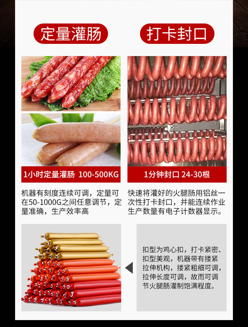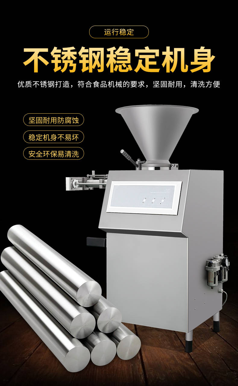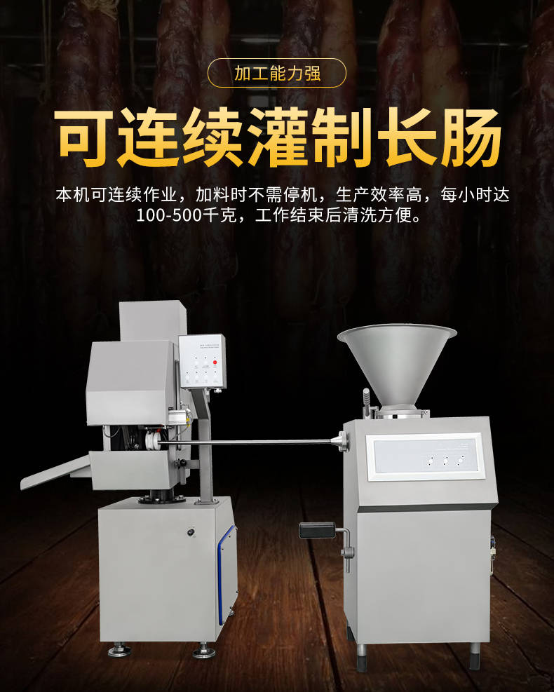 XZ-I型自動(dòng)定量灌腸機(jī),使用優(yōu)質(zhì)不銹鋼制造,符合食品機(jī)械的要求,只需1人操作,特別適合中小型肉食加工廠使用,以各種畜禽類肉糜為原料的香腸、火腿腸、熱狗等天然腸衣、蛋白腸衣、煙熏腸衣等制品,可以灌制定重量單腸,也可連續(xù)灌制長腸。