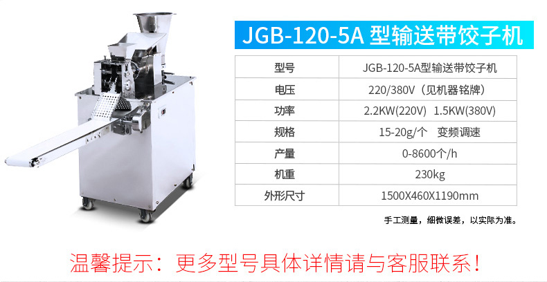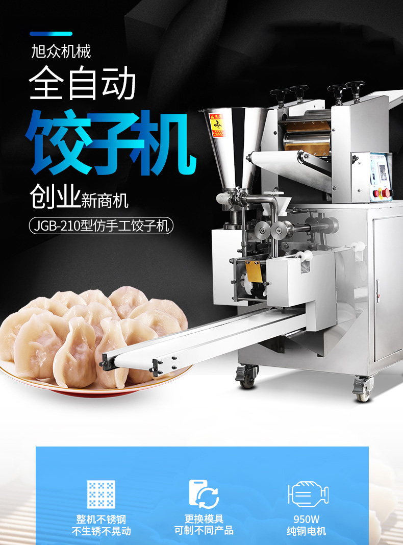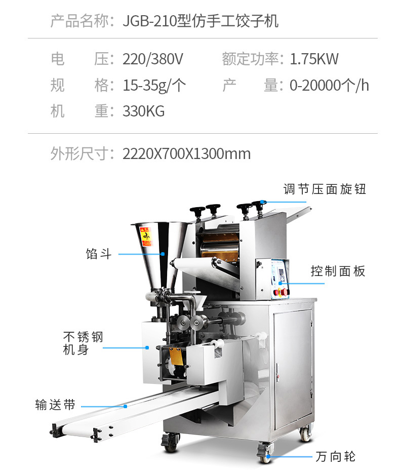 JGB-210型仿手工餃子機(jī),本機(jī)采用自動(dòng)壓面皮包餃子的新工藝技術(shù),本機(jī)可生產(chǎn)速凍餃子等,能生產(chǎn)各種肉餡、肉菜混合餡、全菜餡及其他種餡的餃子,適用于餃子館、食品生產(chǎn)廠家、賓館、飯店、餐廳、團(tuán)體食堂、學(xué)校、部隊(duì)。免費(fèi)上門安裝調(diào)試,贈(zèng)送面點(diǎn)工藝