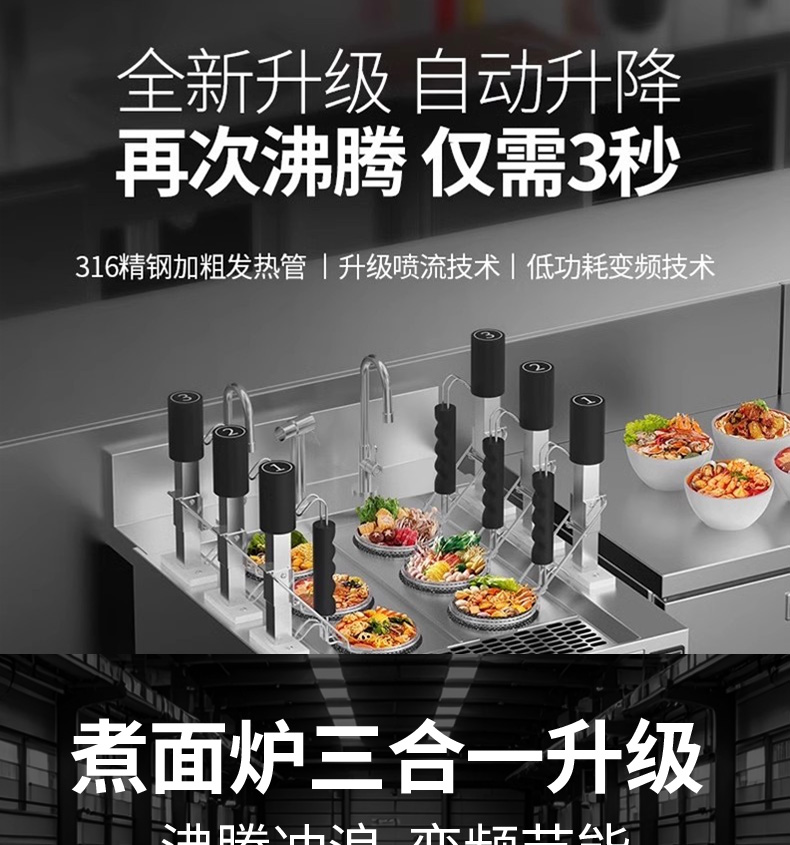 三合一煮面爐,全新升級(jí),自動(dòng)升降再次沸騰,僅需3秒。316精鋼加粗發(fā)熱管、升級(jí)噴流技術(shù)、低功耗變頻技術(shù)。煮面爐三合一升級(jí),沸騰沖浪、變頻節(jié)能。