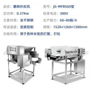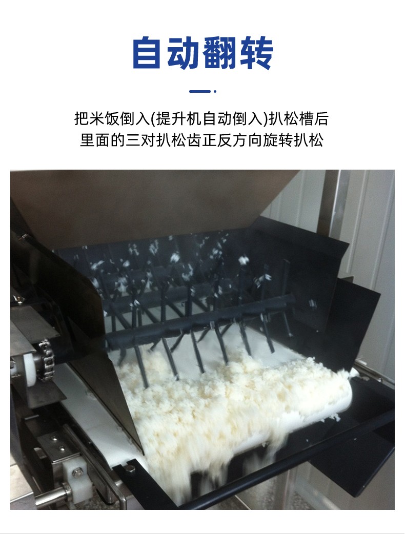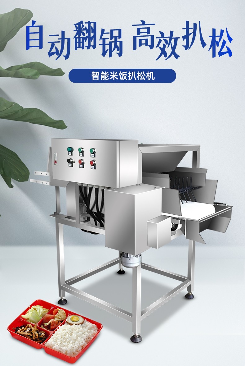 智能米飯扒松機(jī)-翻轉(zhuǎn)扒松機(jī),主要結(jié)構(gòu):由不銹鋼機(jī)架、翻鍋機(jī)構(gòu)、扒松機(jī)構(gòu)輸送機(jī)構(gòu)和電氣自動(dòng)系統(tǒng)等組成。適用對(duì)象:主要用于中央廚房、團(tuán)膳、企事業(yè)單位食堂等