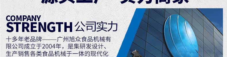 廣州旭眾食品機(jī)械有限公司是一家集科研開發(fā),生產(chǎn)設(shè)計(jì),營銷服務(wù)為一體的現(xiàn)代化生產(chǎn)企業(yè)。現(xiàn)代化生產(chǎn)車間,精湛制造技術(shù),所產(chǎn)機(jī)械歷經(jīng)市場重重考驗(yàn),不斷贏得海內(nèi)外客戶的贊譽(yù)。