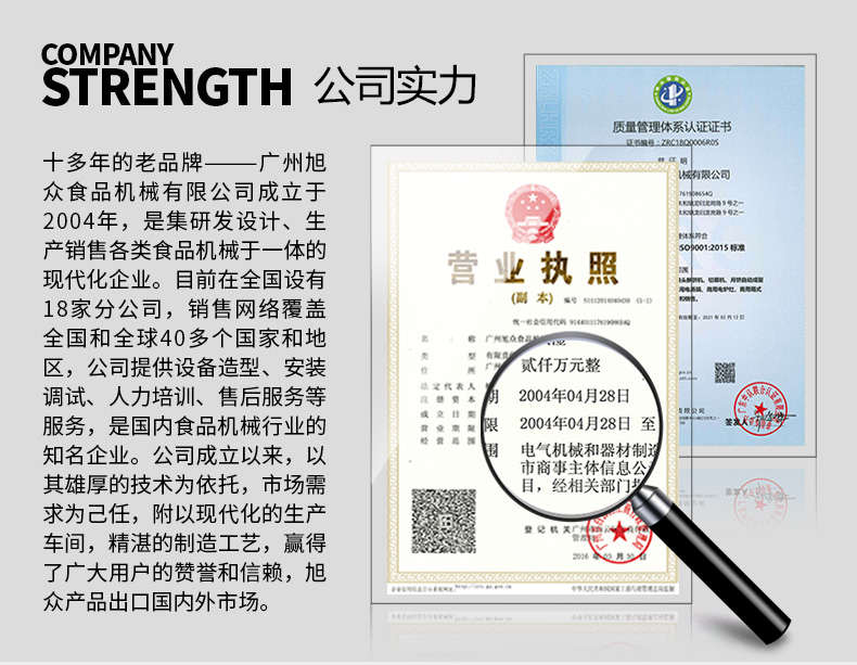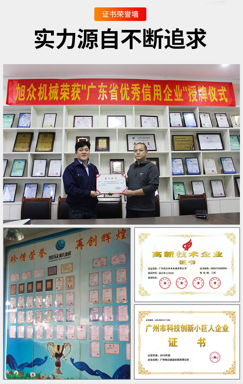 廣州旭眾食品機(jī)械有限公司是一家集科研開(kāi)發(fā),生產(chǎn)設(shè)計(jì),營(yíng)銷(xiāo)服務(wù)為一體的現(xiàn)代化生產(chǎn)企業(yè)?,F(xiàn)代化生產(chǎn)車(chē)間,精湛制造技術(shù),所產(chǎn)機(jī)械歷經(jīng)市場(chǎng)重重考驗(yàn),不斷贏得海內(nèi)外客戶(hù)的贊譽(yù)。