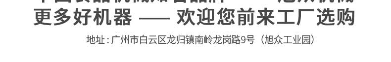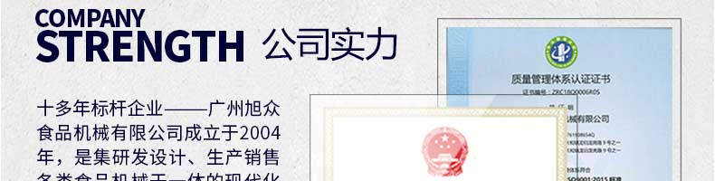 廣州旭眾食品機(jī)械有限公司是一家集科研開發(fā),生產(chǎn)設(shè)計(jì),營(yíng)銷服務(wù)為一體的現(xiàn)代化生產(chǎn)企業(yè)?,F(xiàn)代化生產(chǎn)車間,精湛制造技術(shù),所產(chǎn)機(jī)械歷經(jīng)市場(chǎng)重重考驗(yàn),不斷贏得海內(nèi)外客戶的贊譽(yù)。