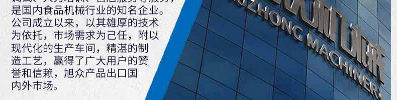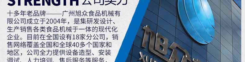 廣州旭眾食品機械有限公司是一家集科研開發(fā),生產(chǎn)設(shè)計,營銷服務(wù)為一體的現(xiàn)代化生產(chǎn)企業(yè)?,F(xiàn)代化生產(chǎn)車間,精湛制造技術(shù),所產(chǎn)機械歷經(jīng)市場重重考驗,不斷贏得海內(nèi)外客戶的贊譽。