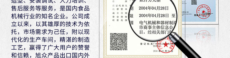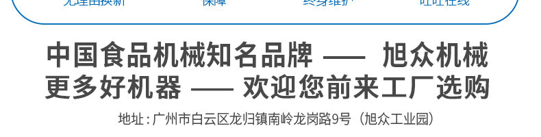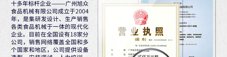 廣州旭眾食品機(jī)械有限公司是一家集科研開發(fā),生產(chǎn)設(shè)計(jì),營(yíng)銷服務(wù)為一體的現(xiàn)代化生產(chǎn)企業(yè)。現(xiàn)代化生產(chǎn)車間,精湛制造技術(shù),所產(chǎn)機(jī)械歷經(jīng)市場(chǎng)重重考驗(yàn),不斷贏得海內(nèi)外客戶的贊譽(yù)。