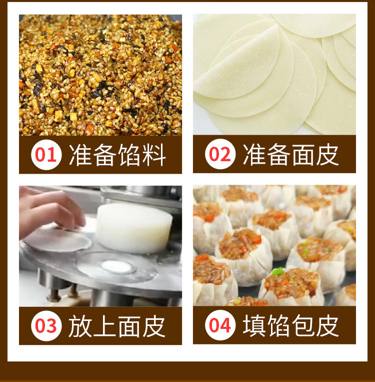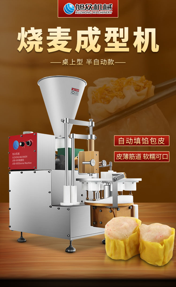 JGB-600燒麥機,自動填餡包皮功能:臺式半自動單聯(lián)式燒麥成型機,可以使用手工燒麥皮配合機器生產(chǎn)燒賣,其面皮口感好,產(chǎn)品外形美觀。餡料多與少可調(diào)節(jié)高效率1800個小時