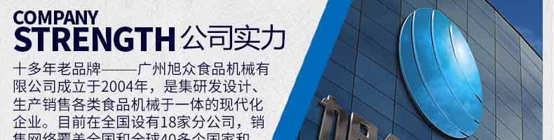 廣州旭眾食品機械有限公司是一家集科研開發(fā),生產(chǎn)設計,營銷服務為一體的現(xiàn)代化生產(chǎn)企業(yè)?,F(xiàn)代化生產(chǎn)車間,精湛制造技術,所產(chǎn)機械歷經(jīng)市場重重考驗,不斷贏得海內(nèi)外客戶的贊譽。