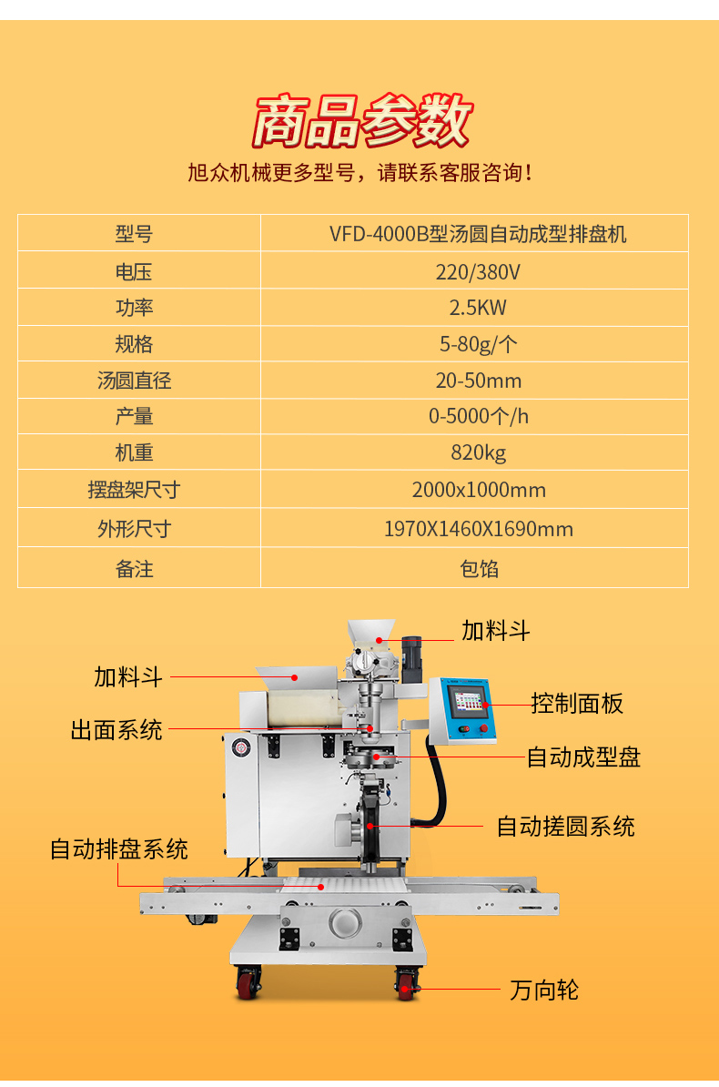 今天給大家介紹一下這款VFD-4000B型湯圓機,為什么要介紹它呢,這款機械制作多品種食品,關鍵是產(chǎn)量效率高,1小時的產(chǎn)量可達5000個,相當于20-30個工人同時手工制作湯圓,真正的低投入,高收益,省錢省工,可制作各式包餡食品,如湯圓、豆沙包、南瓜餅等,是賓館、飯店、企業(yè)、學校、部隊等公共食堂和專業(yè)戶理想的面食機械。