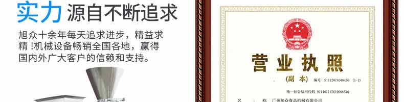 廣州旭眾食品機械有限公司是一家集科研開發(fā),生產(chǎn)設(shè)計,營銷服務(wù)為一體的現(xiàn)代化生產(chǎn)企業(yè)?,F(xiàn)代化生產(chǎn)車間,精湛制造技術(shù),所產(chǎn)機械歷經(jīng)市場重重考驗,不斷贏得海內(nèi)外客戶的贊譽。