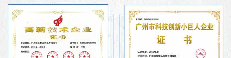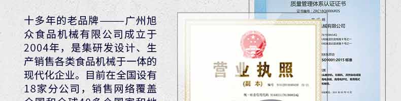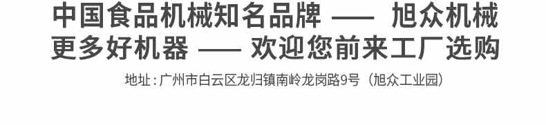 廣州旭眾食品機(jī)械有限公司是一家集科研開發(fā),生產(chǎn)設(shè)計,營銷服務(wù)為一體的現(xiàn)代化生產(chǎn)企業(yè)。現(xiàn)代化生產(chǎn)車間,精湛制造技術(shù),所產(chǎn)機(jī)械歷經(jīng)市場重重考驗(yàn),不斷贏得海內(nèi)外客戶的贊譽(yù)。